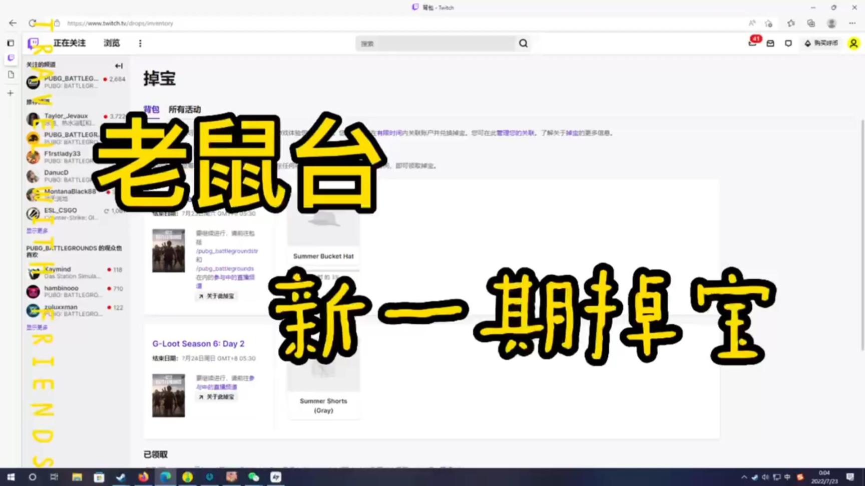 这时右边弹幕处会显示Drop Twitch活动,这时我们就已经参加了掉宝活动了,在直播间观看1小时(裤子需要看多久目前还不知道),1小时后后,在掉宝总界面找到掉宝背包,进行领取,这时我们的掉宝物品就会出现在我们的PUBG仓库中了